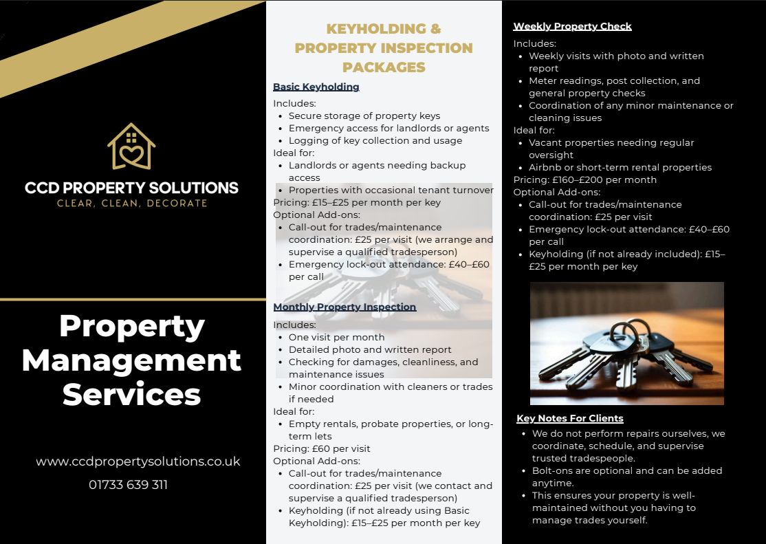 redecorating to property clearances, keyholding, property inspections, and management coordination, we take care of the hard work so you don’t have to lift a finger.