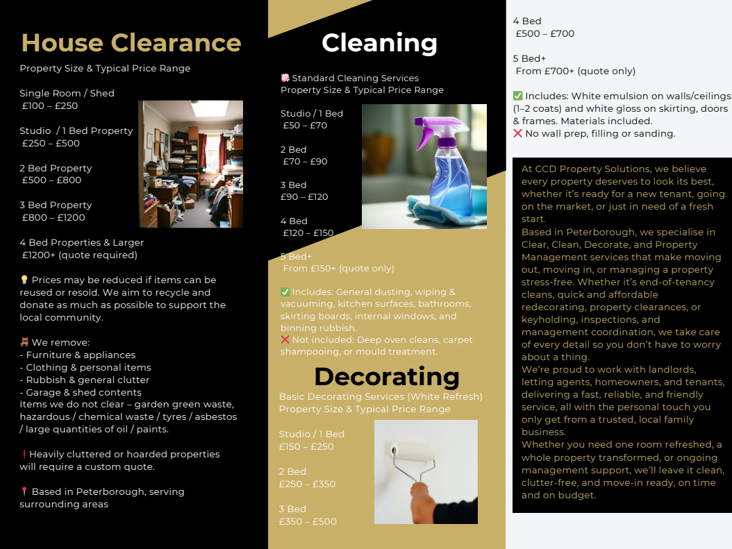 Based in Peterborough, we specialise in Clean, Clear, Decorate, and Property Managementservices that make moving out, moving in, or managing a property stress-free. From sparkling end-of-tenancy cleans and quick, budget-friendly